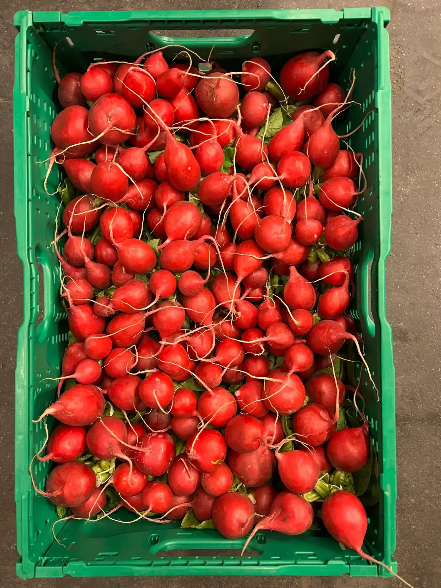 Sie werden frisch geerntet, sorgfältig sortiert und in stabilen Mehrwegkisten geliefert. Ob als knackige Zutat im Salat, als Garnitur oder einfach pur mit etwas Salz – Radieschen bringen Frische und Würze in jede Küche.